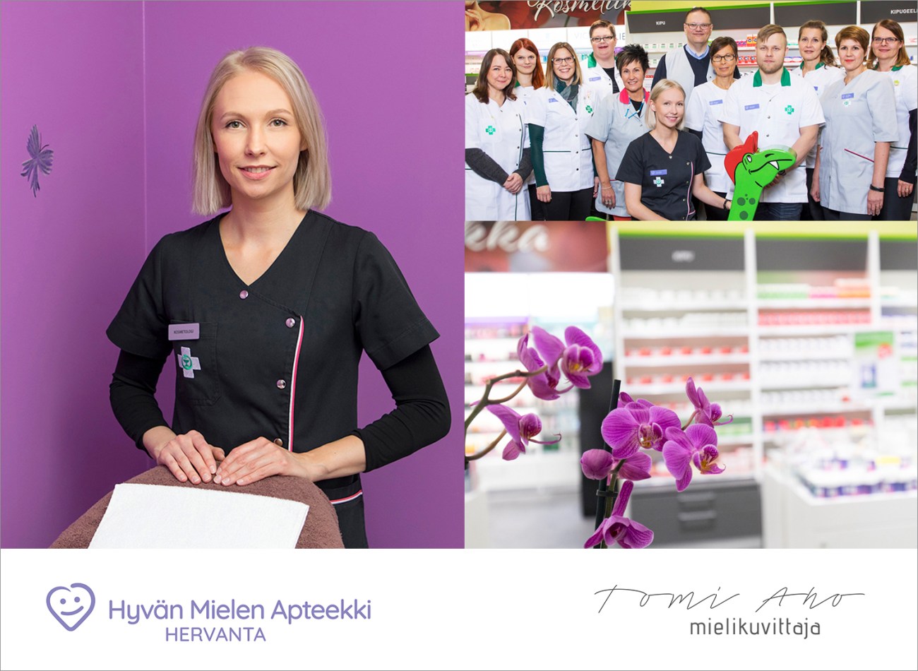 ”Kuvaus apteekilla sujui jouhevasti, vaikka se järjestettiin aukioloaikaan. Tomi kuvasi meistä ryhmäkuvan, yksittäiset henkilökuvat, sisämiljöön useasta kulmasta, asiakaspalvelukuvia sekä kosmetologin työpisteessään. Sain kuvauspäivänä pdf-näytteen sähköpostiini, josta valitsin kuvat. Valmiit kuvat saimme käyttöömme jo seuraavana päivänä.”