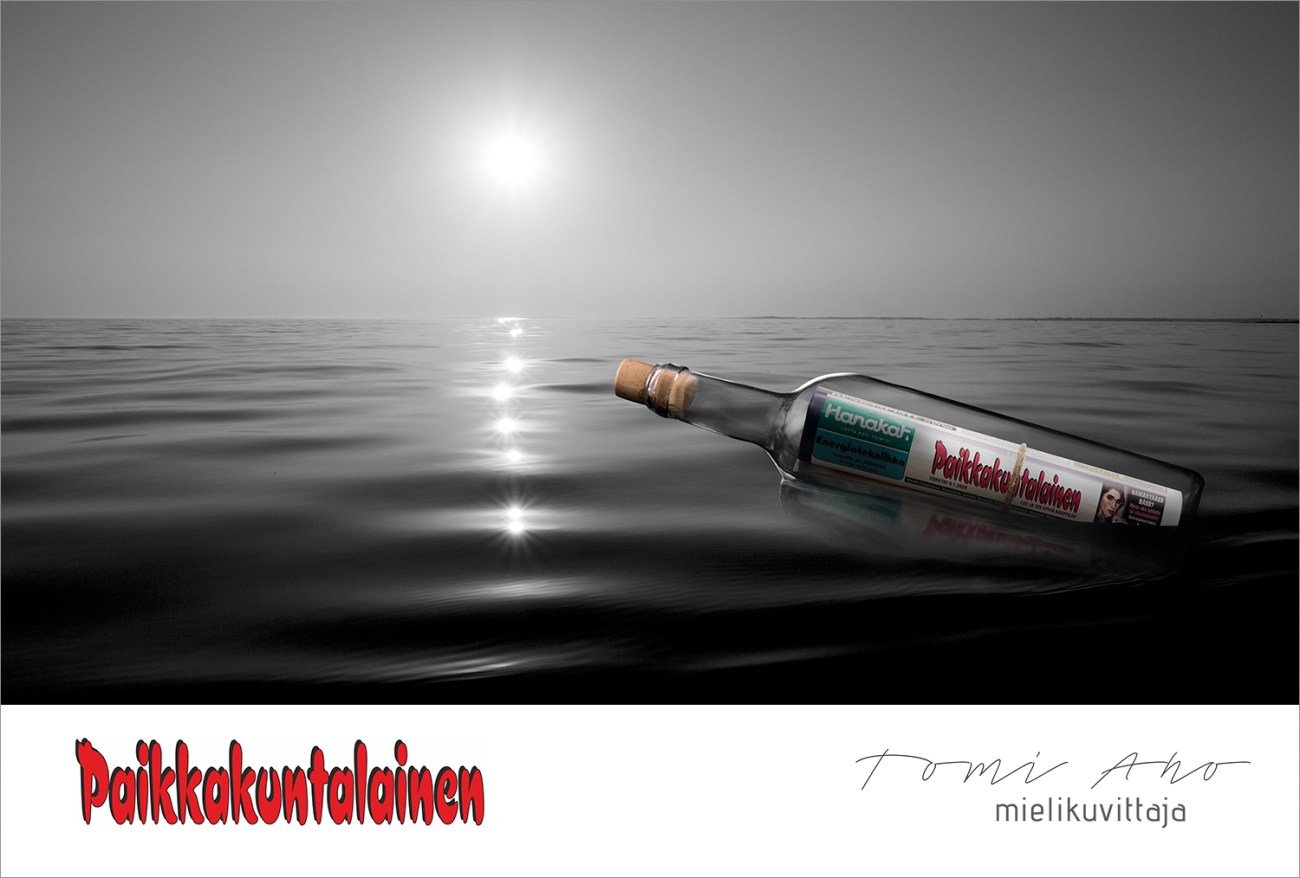 ”Kun soitin Tomille ja kerroin, että tarvitsisimme tuoreita markkinointikuvia, alkoi hän ideoimaan välittömästi. Yhtenä ideana Tomi ehdotti tummasävyisessä merimaisemassa lipuvaa pullopostia. Lopputulos näytti ideaakin paremmalta. Samalla tilasimme kolme muutakin kuvaa. Yhteistyötä on takana jo yli 15 vuotta.”